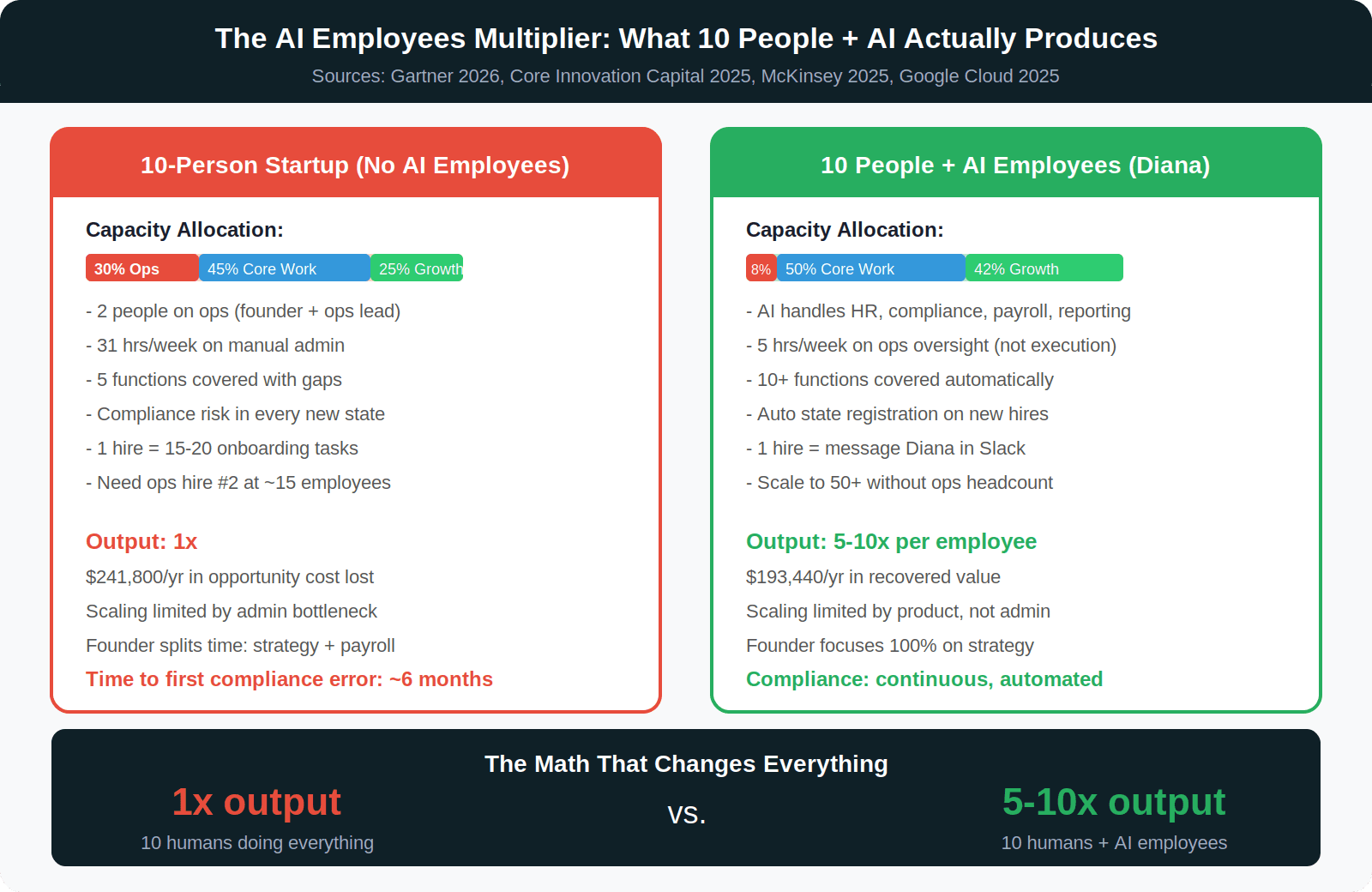 For a 10-person startup, Diana is the difference between two people spending 31 hours per week on ops and zero people spending time on ops. It is the first AI employee your team hires, and the one that pays for itself within the first month.