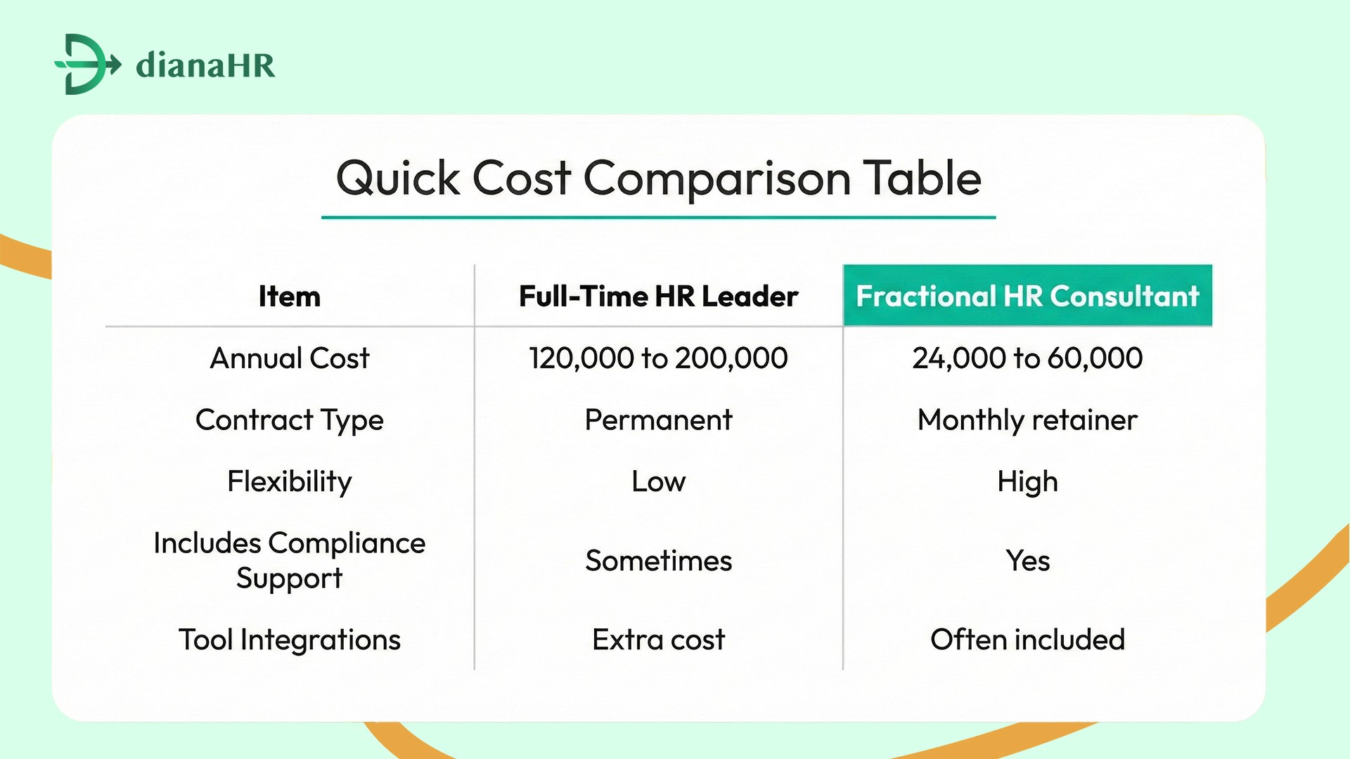 A full-time HR leader delivers steady support but creates high fixed costs. Salary, benefits, bonus, insurance, and recruiting fees stack up fast. A fractional HR consultant gives flexible support and protects cash flow.