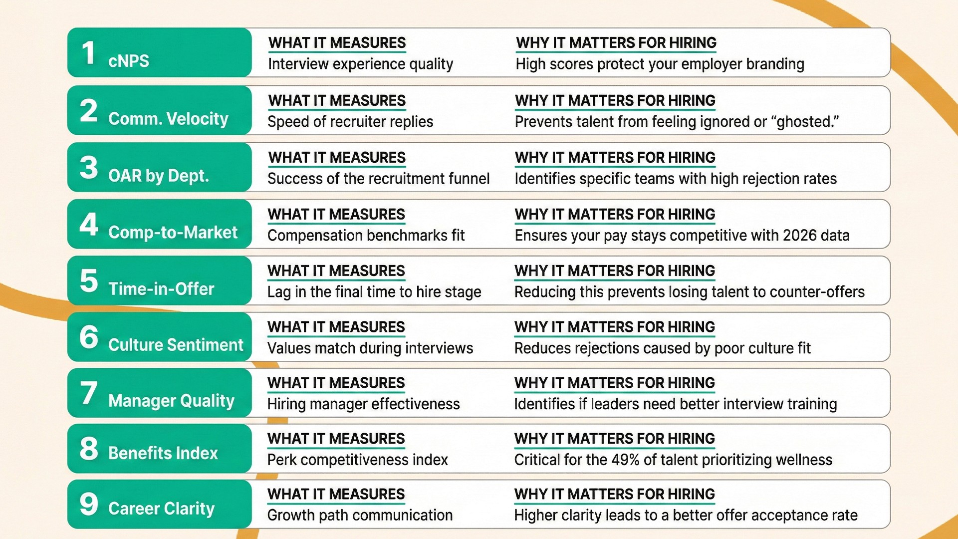 This score tracks the quality of your interview experience. You ask candidates if they would recommend your process to others. If your cNPS is low, your employer branding suffers. Many people reject an offer simply because the interview felt disrespectful. Use these HR metrics to find and fix those negative interactions.