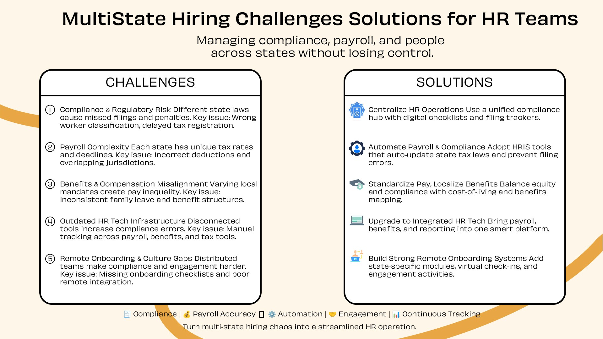 As multi state hiring expands, these HR hurdles can multiply quickly. The next section outlines practical solutions that help simplify compliance, payroll, and onboarding across states while keeping operations scalable and secure.