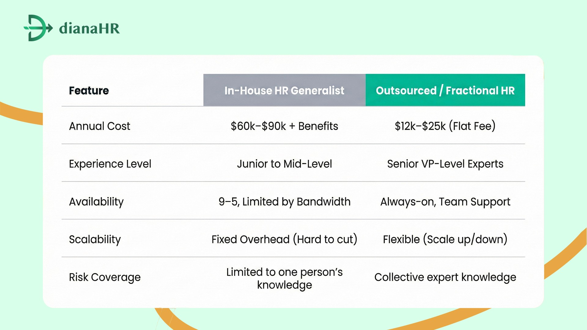Outsourcing HR functions solves this immediately. You don't need to do it alone. DianaHR provides the fractional HR support you need to scale safely. You get the protection of an outsourced HR department with the speed of AI.
