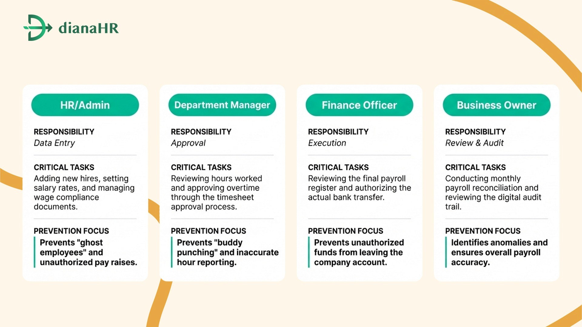 DianaHR builds these payroll controls directly into your operations. Our platform enforces segregation of duties by requiring multiple approval levels for every change.