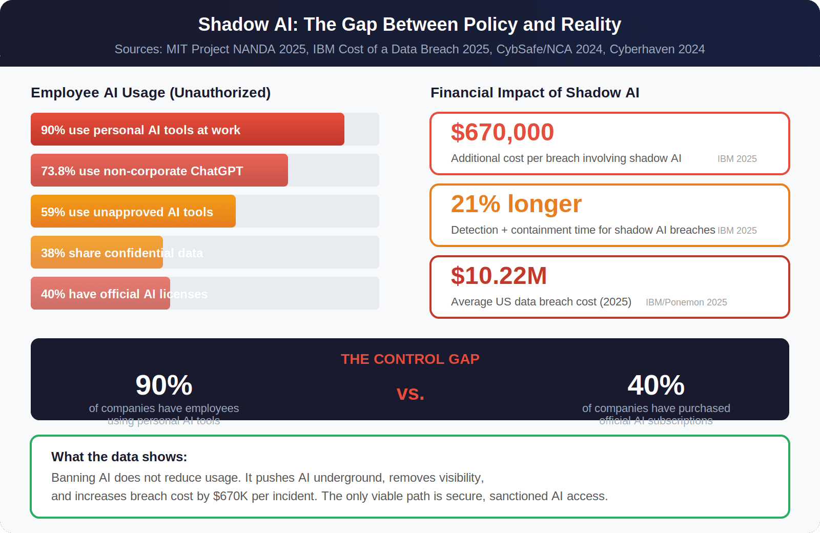 IBM's 2025 Cost of a Data Breach Report quantifies the financial damage. Organizations with high levels of unsanctioned AI activity pay an average of $670,000 more per breach than organizations with proper AI governance. These breaches also take 21% longer to detect and contain because security teams have zero visibility into the attack vector, no logs to trace, and no alerts to trigger. (IBM Cost of a Data Breach Report, 2025)